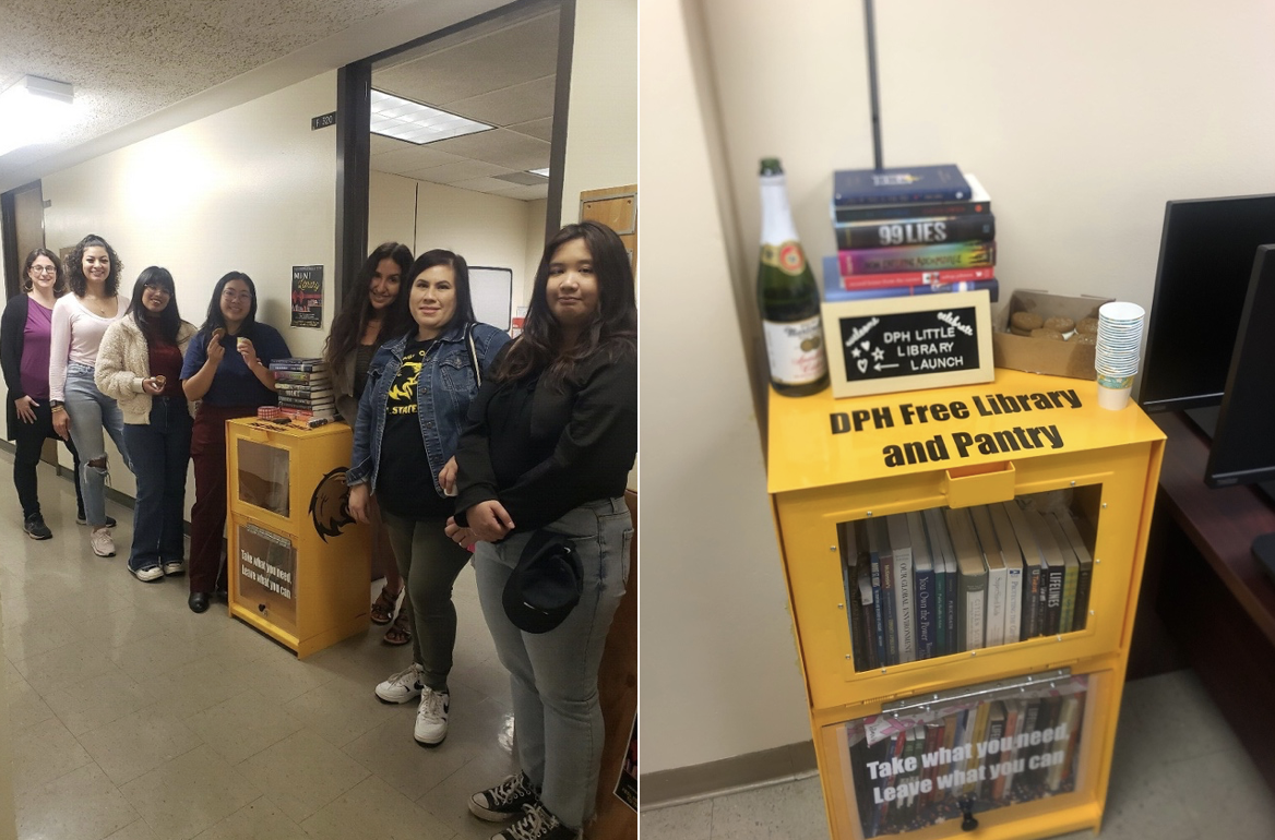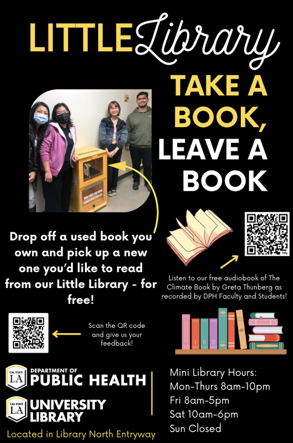 The Public Health Student Association at Cal State LA, guided by Dr. Evelyn Alvarez, created a Little Free Library to promote climate literacy and encourage reading on campus. The project began after the pandemic disrupted earlier plans for a sustainability film festival. Students and faculty worked together to design and install the library, which features books on climate change, public health, and leisure reading. It was first placed in Simpson Tower and later relocated to the University Library for greater accessibility. Community members can take or donate books, and a survey with a QR code collects feedback to track its impact. The project highlights the importance of adaptability, collaboration, and creative public health interventions that support literacy, environmental awareness, and student engagement.